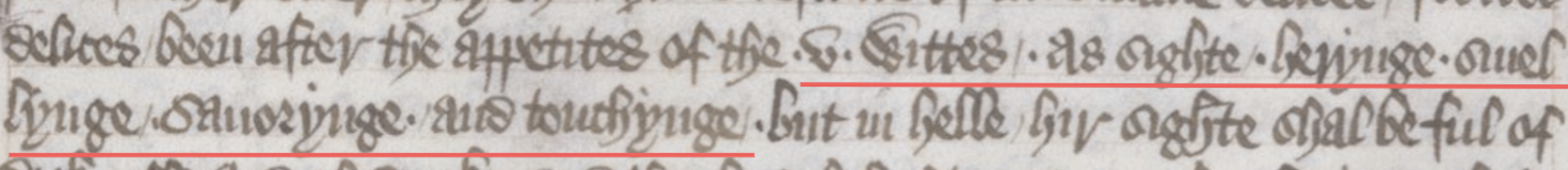 A section from Chaucer's "Parson's Tale" that explains the five senses. Ellesmere MS, f. 209v. Underlining is my addition.
